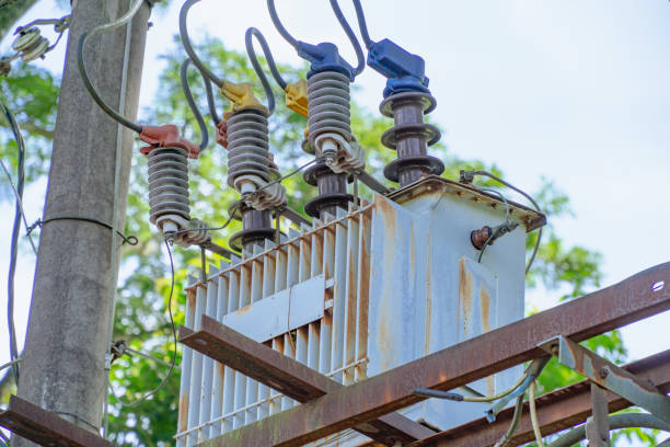 Electrical equipment. Pole-mounted distribution transformer used to provide "split-phase" power for residential and light commercial service. Distribution system (transmission) of electricity